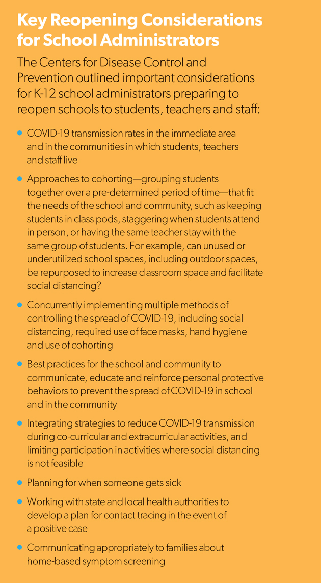 Whether schools open now or later, preparing classrooms for students to return means mitigating health risks above all else. As administrators and risk professionals tackle when and how to resume on-campus operations, health and safety questions should be considered at the regional level. “You want to look at what public health officials and the local and state governments are saying,” said Melanie Bennett, risk management counsel at United Educators. “Are they recommending that schools reopen in your area? That is the absolute starting point.”