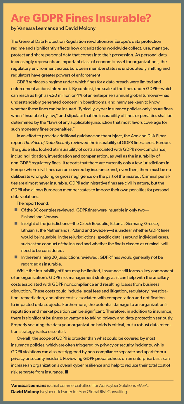 A big issue is whether the GDPR fines can be insured (see sidebar). In May, Aon and DLA Piper issued a guide examining this question for all European countries. While certain types of fines cannot be insured in almost any country, there is still a lot that a cyber insurance policy would cover in the event of a GDPR-related enforcement action, such as costs associated with an investigation, including potential legal and expert fees; compensation claims from individuals brought against a company as a result of non-compliance with the GDPR; and costs of repairing the damaged reputation in the wake of a publicized enforcement action. In any case, the potential uninsurability of the fines (arguably the highest potential exposure in the event of an enforcement action), or at least the present uncertainty as to whether the fines can be covered, may be a significant reason more companies are not turning to cyber insurance as a GDPR risk management tool. It is unlikely that European businesses are being lulled by a false sense of security that other lines of insurance provide coverage for a GDPR-related exposure, however. While certain losses related to a cyberattack or a data breach have historically been covered under general liability or property insurance policies (at least in the United States), GDPR-related risks are almost certainly not going to be captured under the wording of these other products.