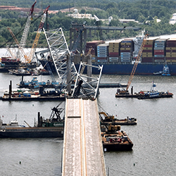 After being struck by a container ship, the Baltimore-area Francis Scott Key Bridge collapsed into the Patapsco River. The crew lost propulsion control after the ship suffered an electrical blackout, resulting in it drifting off-course and crashing into one of the bridge’s piers. The collision killed six maintenance workers on the bridge’s roadway and damaged the ship’s hull and shipping containers onboard. The collapse blocked shipping to and from the Port of Baltimore—one of the East Coast’s busiest ports—for 11 weeks, resulting in an estimated economic impact of as much as $15 million a day. Maryland officials plan to replace the bridge by 2028 at a cost of almost $2 billion. In October, the ship’s owner and operator agreed to pay more than $102 million to settle a lawsuit brought by the Justice Department. The settlement will cover what the U.S. government spent in response to the disaster, including clearing the ship and bridge debris from the Port of Baltimore.